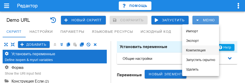 - Запустить - запускает текущий скрипт. Если скрипт не был сохранен, то запустится его предыдущая версия.